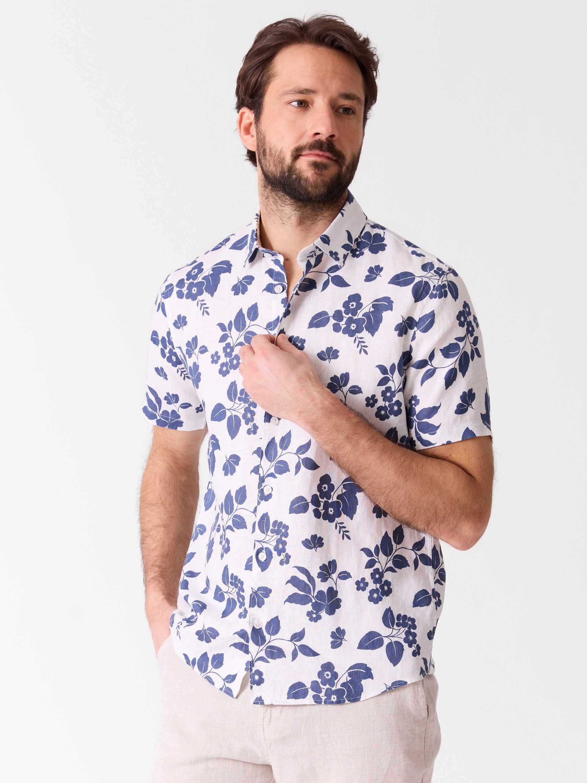 Skjorte i behagelig lin. Skjorten kommer i flere varianter, ensfarget, stripet og mønstret