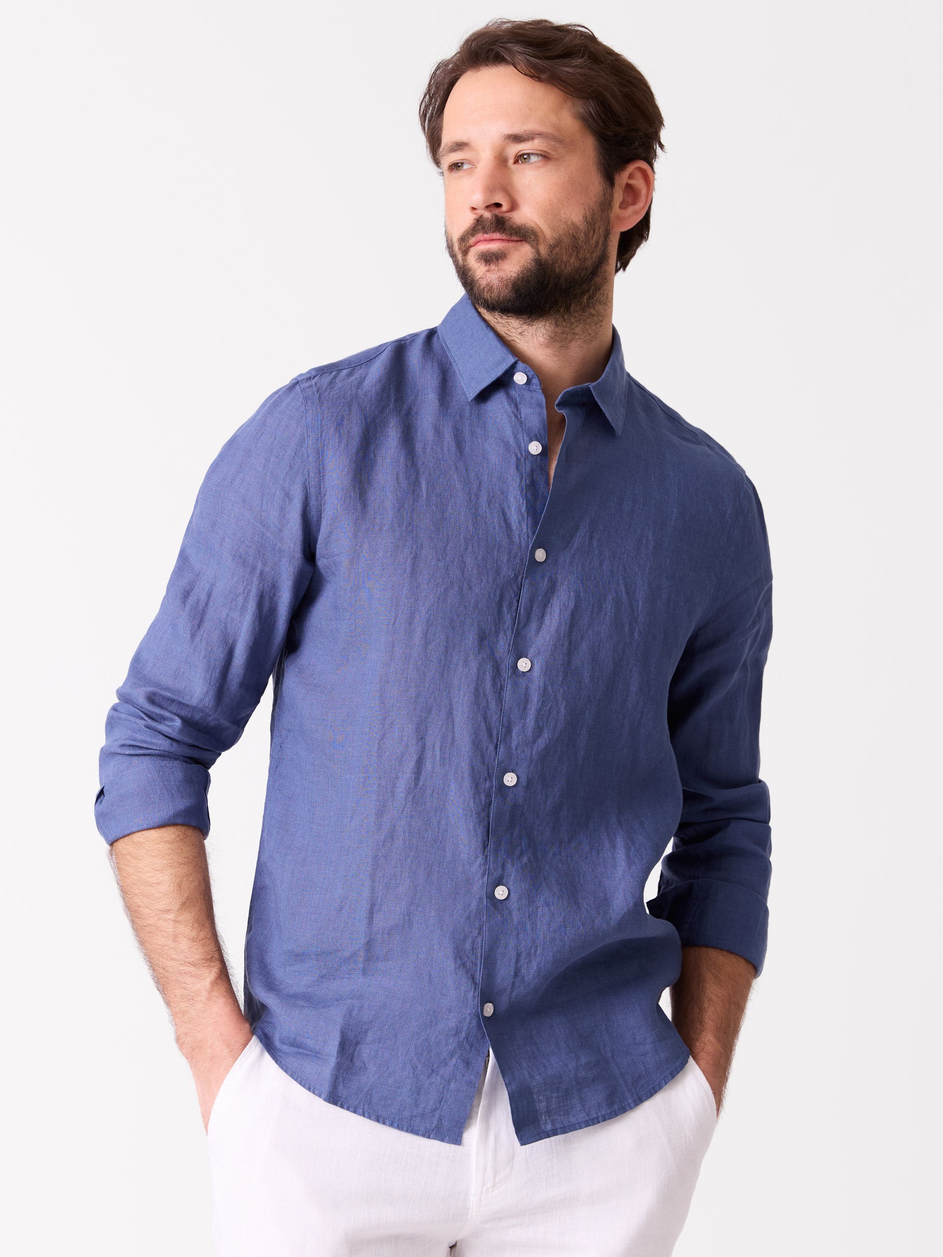Modellen er 190cm og har på seg str MConrad linskjorte
