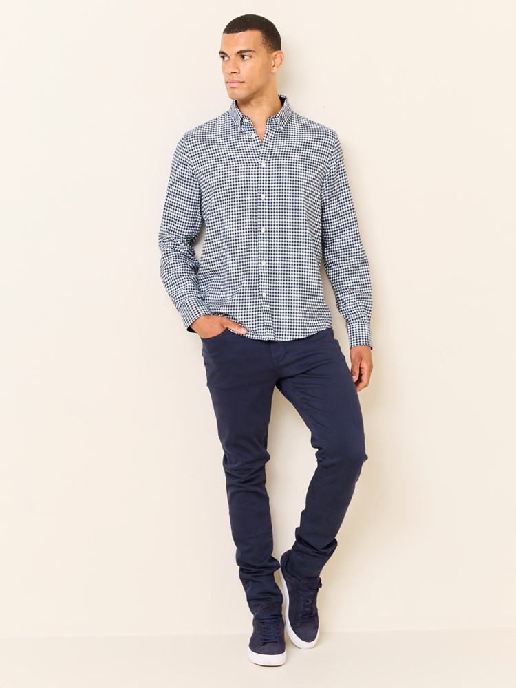 Smårutet skjorte i børstet twillvevet bomull med bærestykke bak. Skjorten har buttondown krage med mørk blå cordfløyelskontrast i nakke og mansjett, logobroderi på brystet, lyse knapper, regulerbar mansjett og regular passform. Modellen er 185 cm høy og har på seg str M.