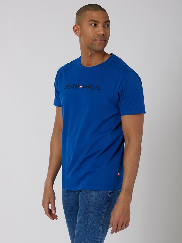 Jean Paul logo t-skjorte i myk 100% bomull med fine detaljer inni nakken. T-skjorten kommer i friske farger, har rund hals med ribkant og tricolore flagg nede i siden. Modellen er 188 cm høy og bruker str L.