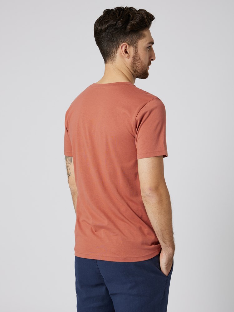 T-skjorte i supima-bomull som er en type slitesterk kvalitets-bomull som krymper mindre enn vanlig bomull. T-skjorten har rund hals, kort erm og normal passform. Modellen er 184 cm høy og har på seg størrelse M.