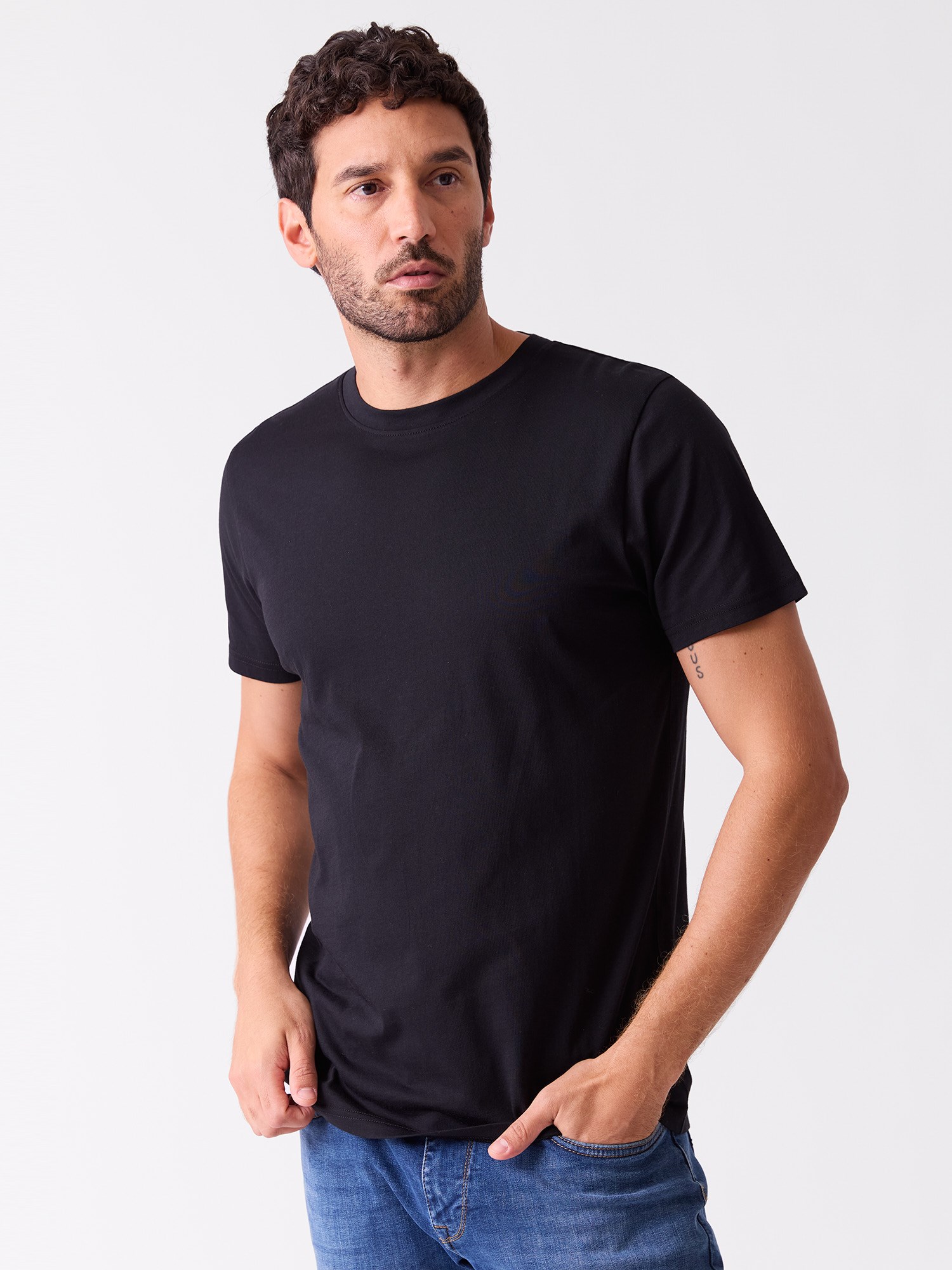 T-skjorte i supima-bomull som er en type slitesterk kvalitets-bomull som krymper mindre enn vanlig bomull. T-skjorten har rund hals, kort erm og normal passform.