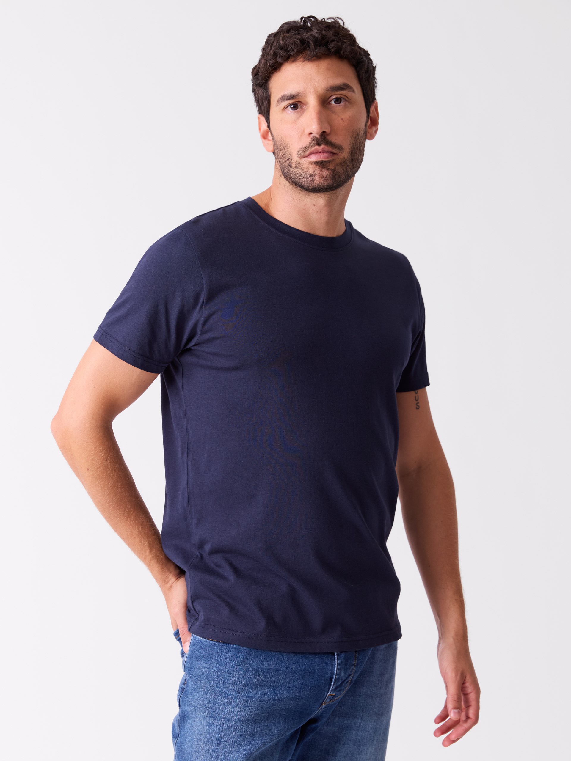 T-skjorte i supima-bomull som er en type slitesterk kvalitets-bomull som krymper mindre enn vanlig bomull. T-skjorten har rund hals, kort erm og normal passform.