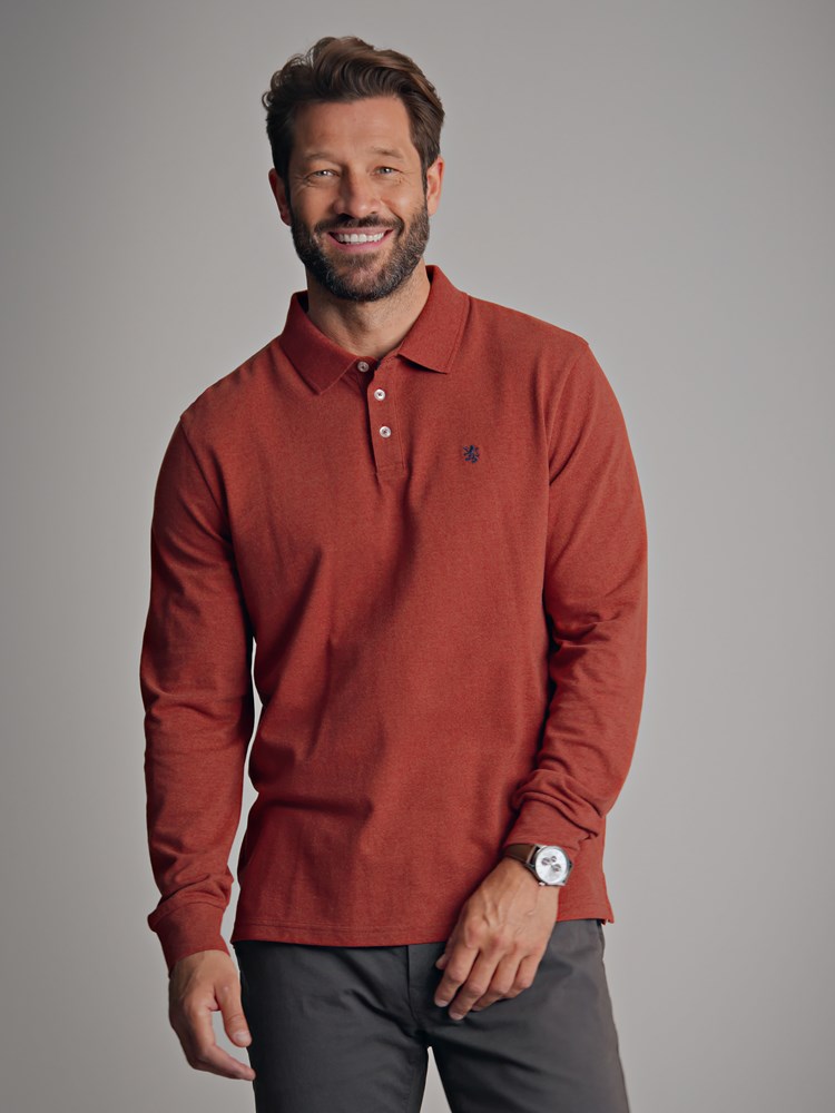 Langermet polo piquet med ribmansjett og krage. Piquettrøyen har stolpe med tre knapper og ett lite broderi i kontrastfarge på brystet. Normal passform.