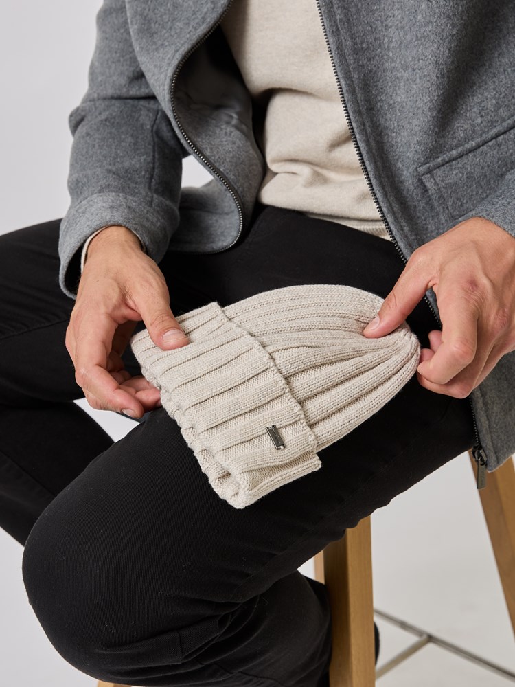 Ribbestrikket lue i myk bomull med innslag av kasjmir. Luen har oppbrett og en liten metallbadge med logo på siden.