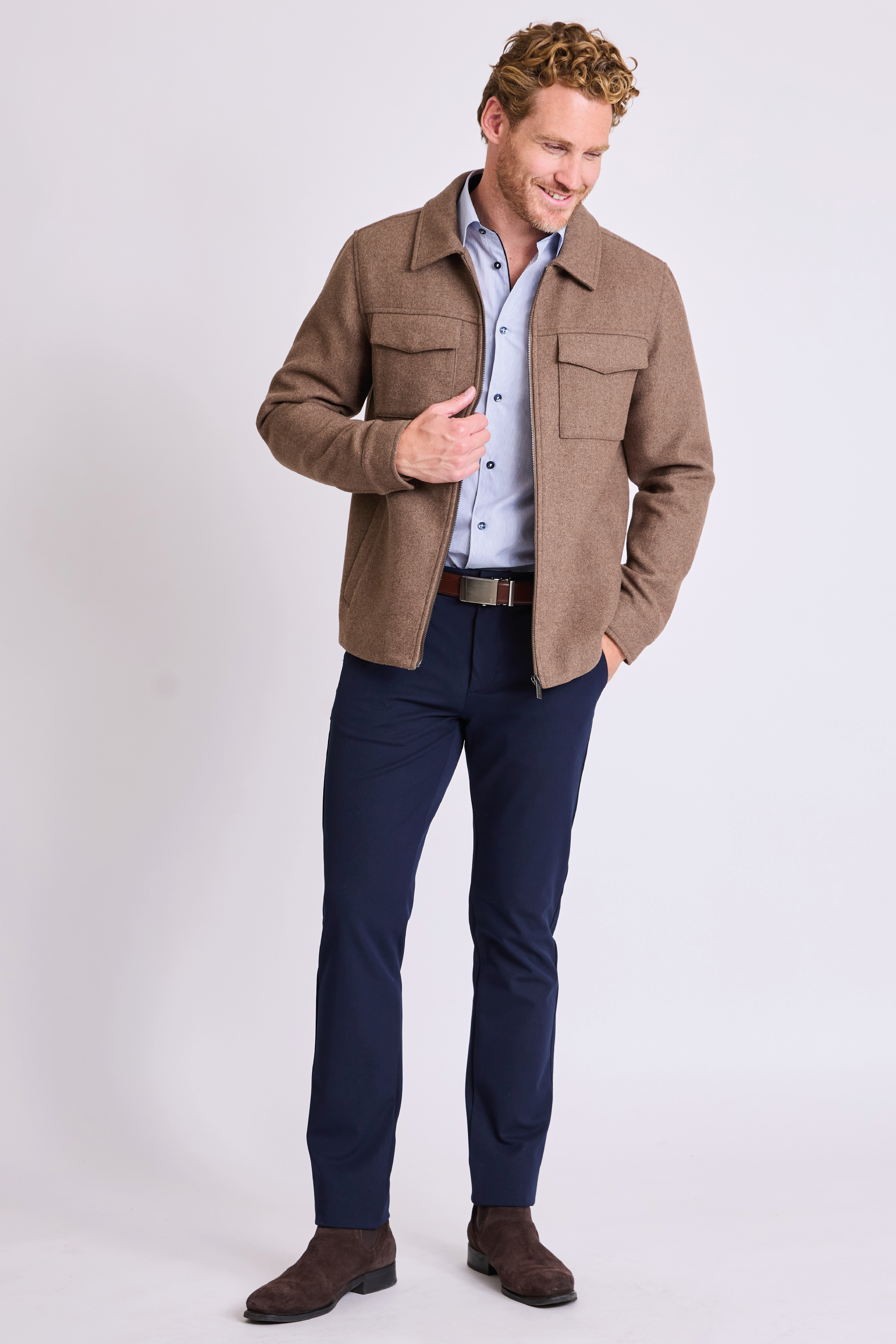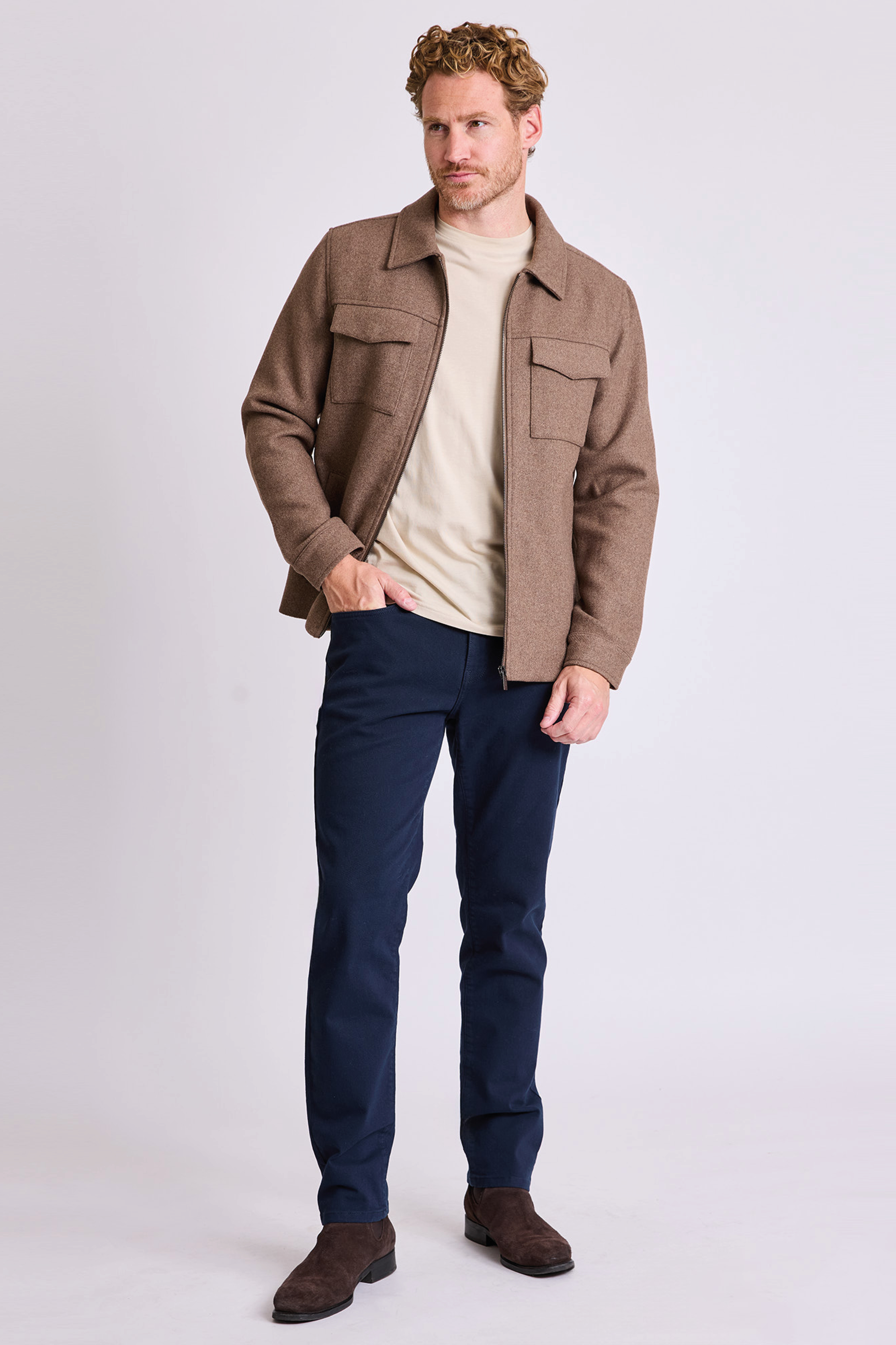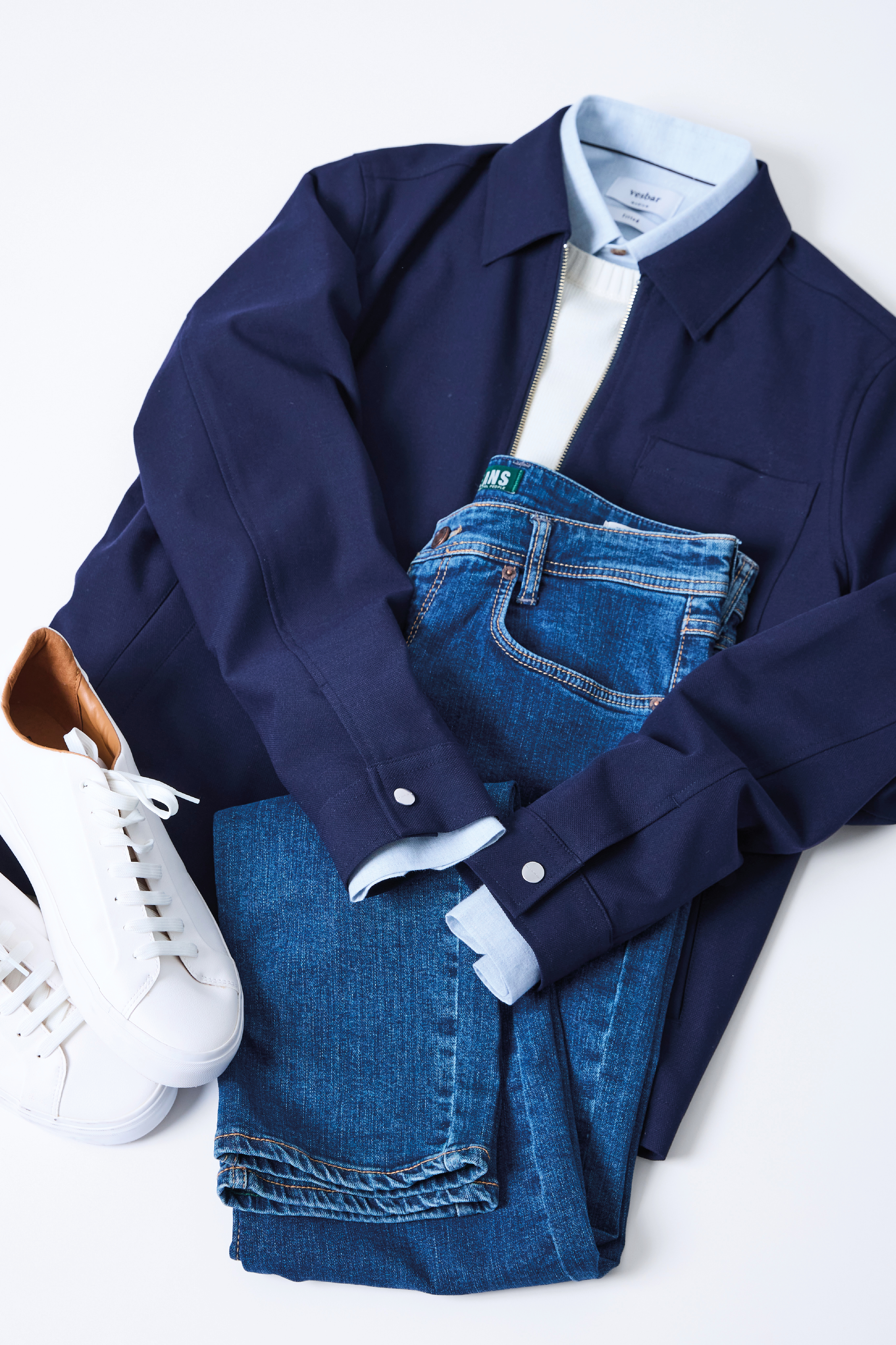 For en litt mer avslappet look samtidig som du fortsatt er kledd, kan du bruke skjortejakken med en ensfarget t-skjorte og en marineblå bukse. Bruk gjerne t-skjorten utenpå buksen og style antrekket med noen enkle sko.