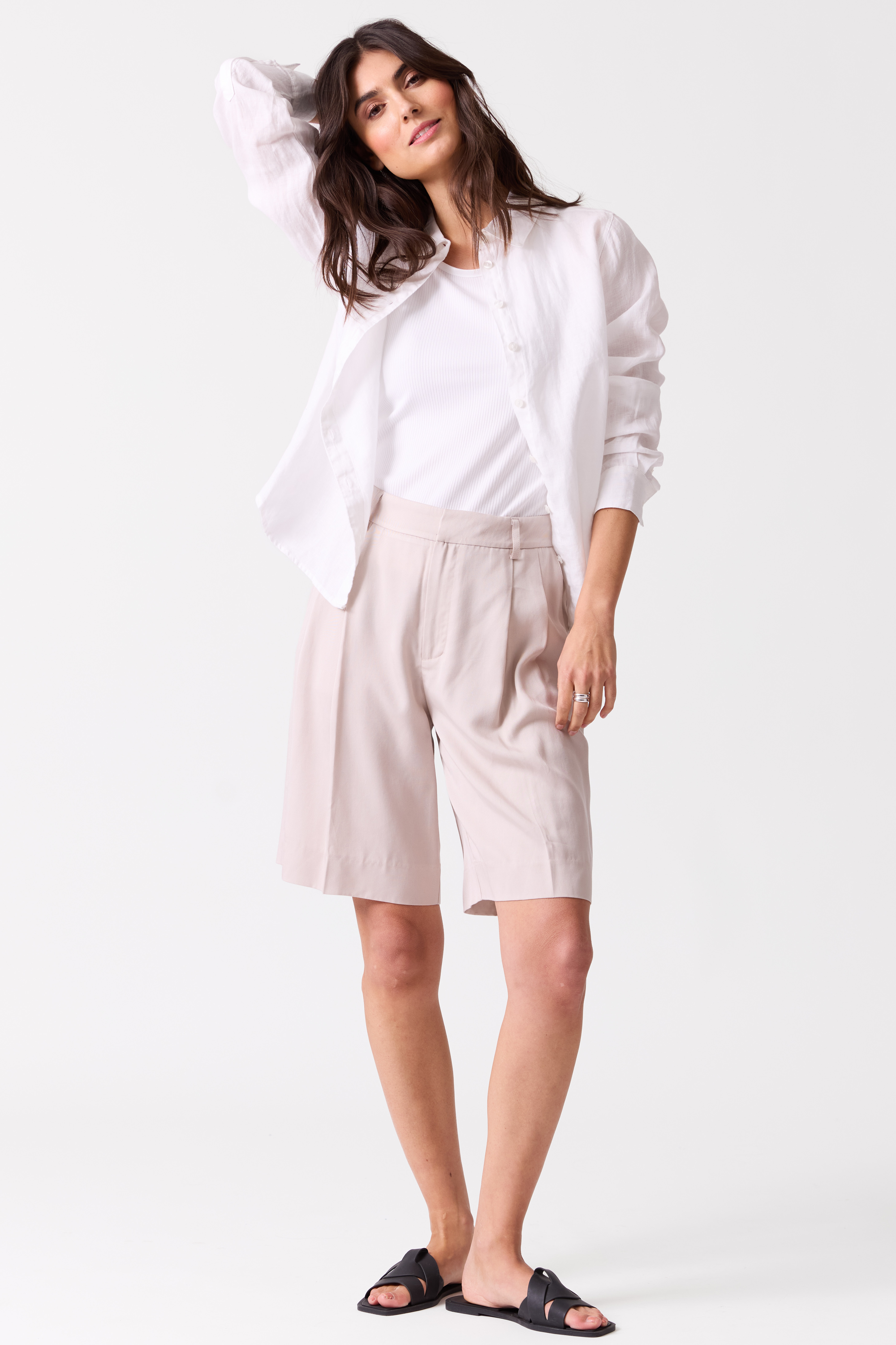 Her har vi stylet shortsen med en enkel singlet og en åpen linskjorte. Dette antrekket passer både til hverdags og til late feriedager denne sommeren.