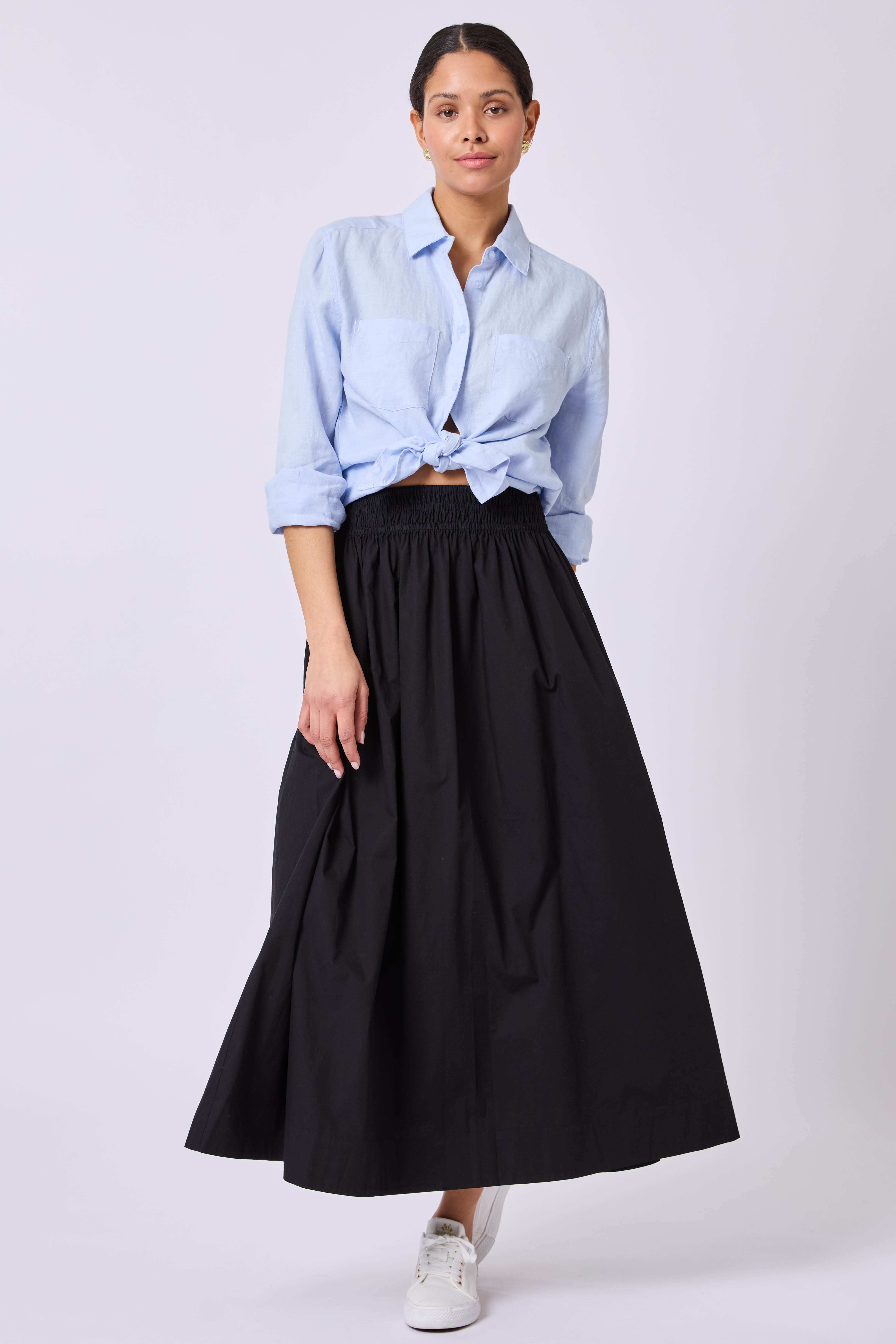 Med en knytebluse i lin sammen med skjørtet får du en sommerlig og stilig look. Style dette antrekket med sneakers og du er klar for alle sommerens aktiviteter.