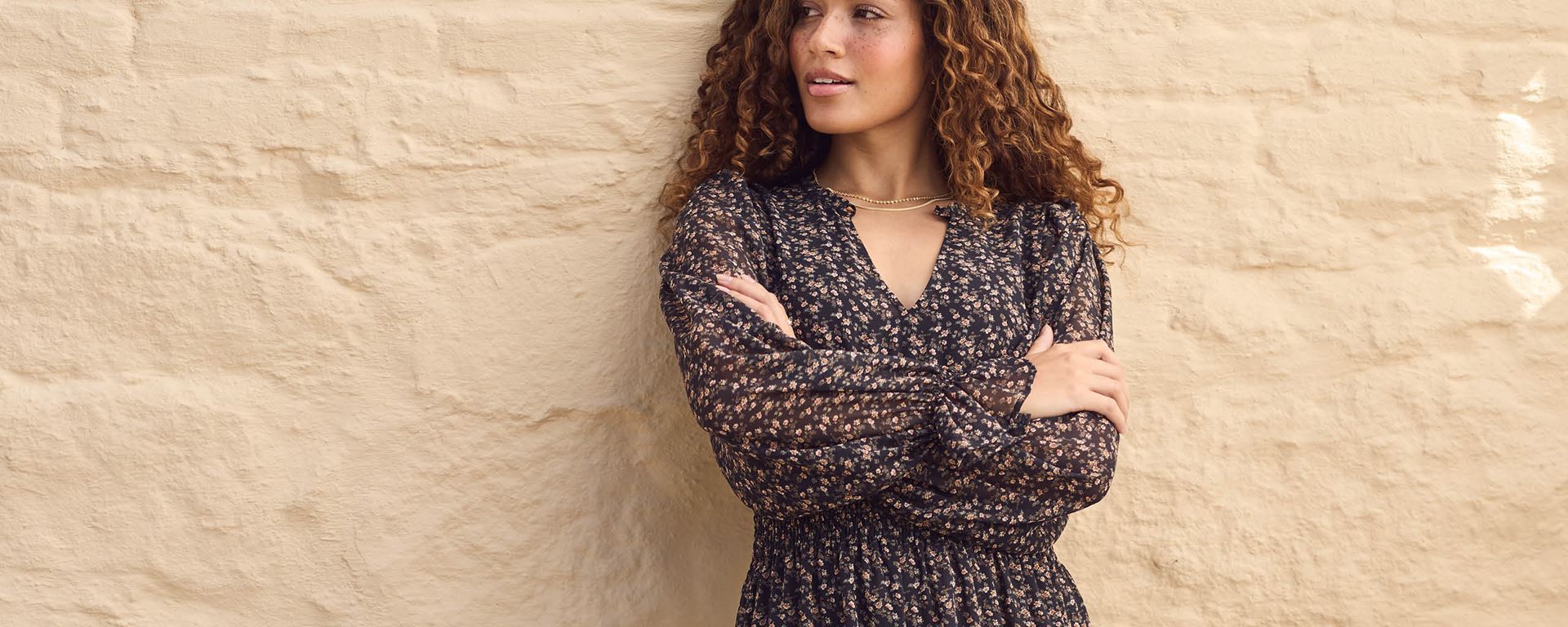 Mønstret kjole i lett resirkulert polyester med v-utringing. Lang pufferm med elastikk og rysjekant. Bred elastikk i livet og utskrådd skjørt med høy kappe.